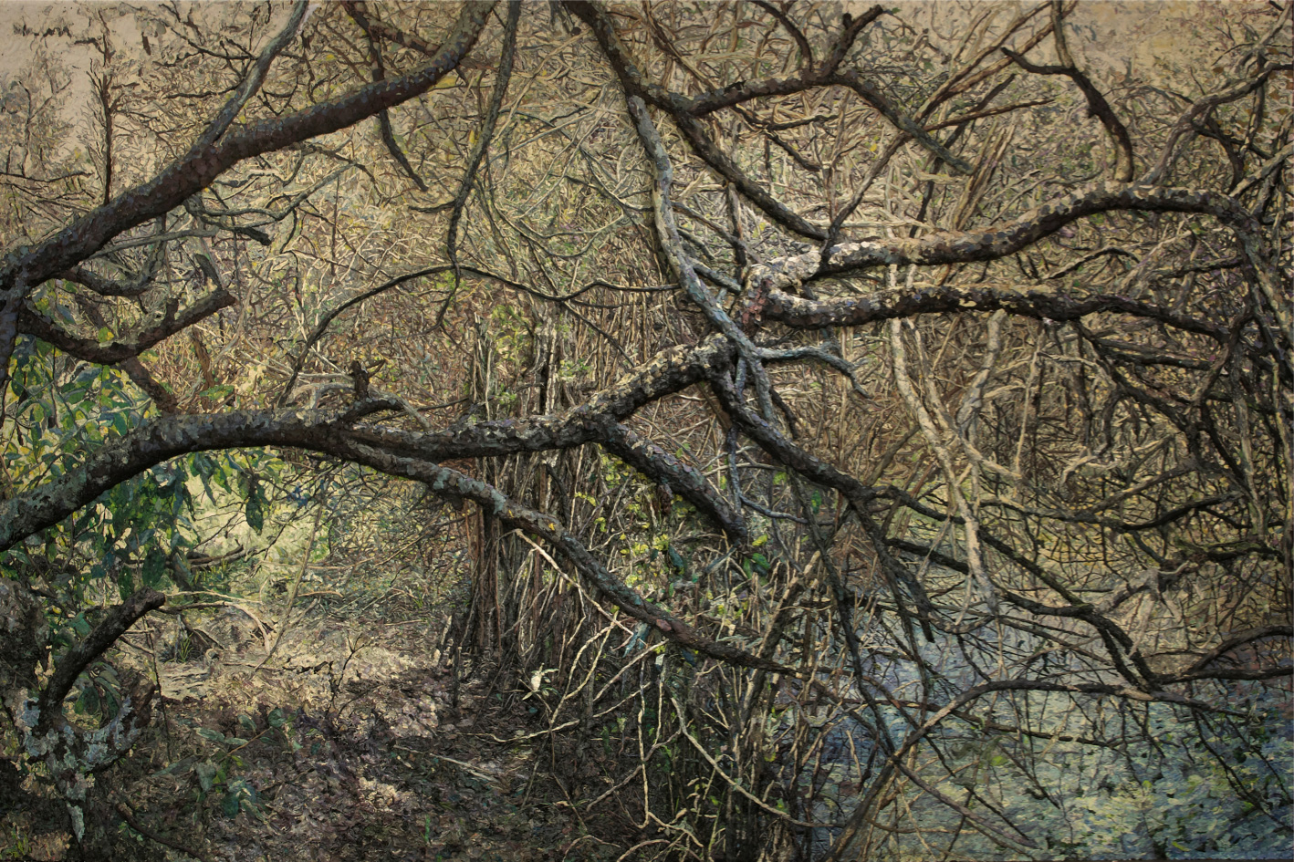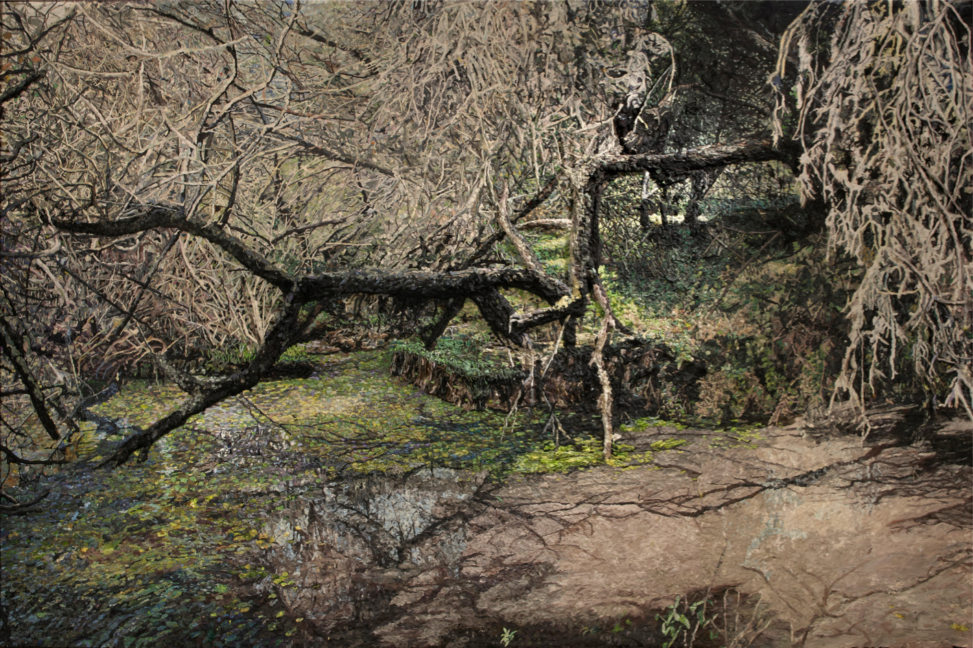 La instalación configura un paisaje imponente de 45 metros lineales distribuidos en 15 paneles. Realizada en plastilina —el material característico del Grupo Mondongo—, la pieza surge de un viaje de los artistas a Entre Ríos, donde se sintieron impactados por la naturaleza cruda de la región y sus inundaciones. La obra es al mismo tiempo un inventario de todas las posibilidades matéricas de la plastilina exploradas por los artistas y una reflexión sobre el género paisajístico.