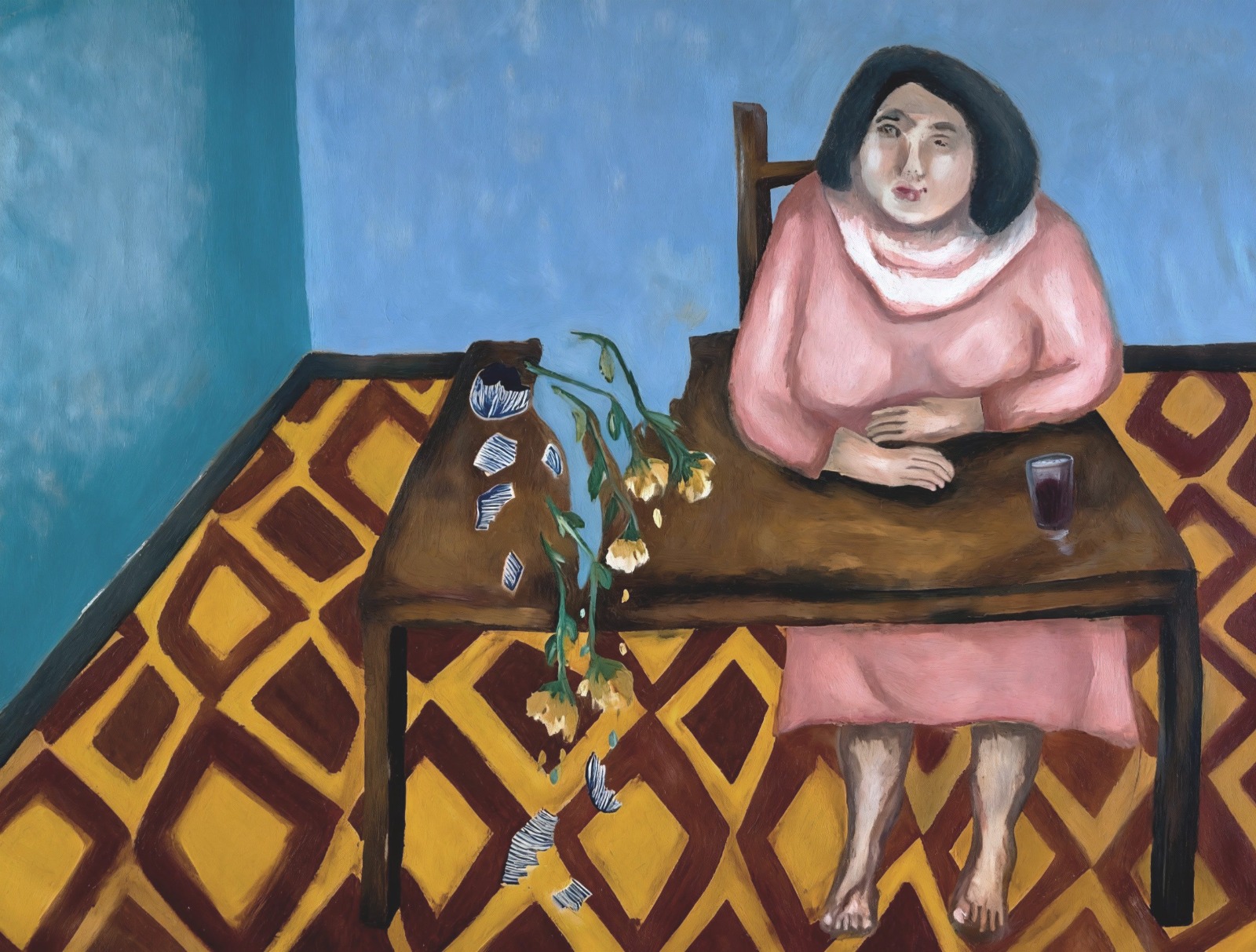La identidad no falta; nunca estuvo. Las figuras brotan de un procedimiento: no provienen de un cuerpo real, se precipitan desde un territorio sin nombre; se levantan como arquetipos o tipologías anónimas, casas mínimas para un cuerpo posible. Cuerpos como muros sin cimientos, estructuras inestables que se sostienen por tensiones mínimas y vigas cromáticas que distribuyen un peso invisible, rostros que, a fuerza de repetición, funcionan como fachadas destinadas a recomponerse. La identidad no se representa, se inventa a partir de signos mínimos que insisten: un suéter fucsia, un objeto arbitrario, un gesto suspendido.